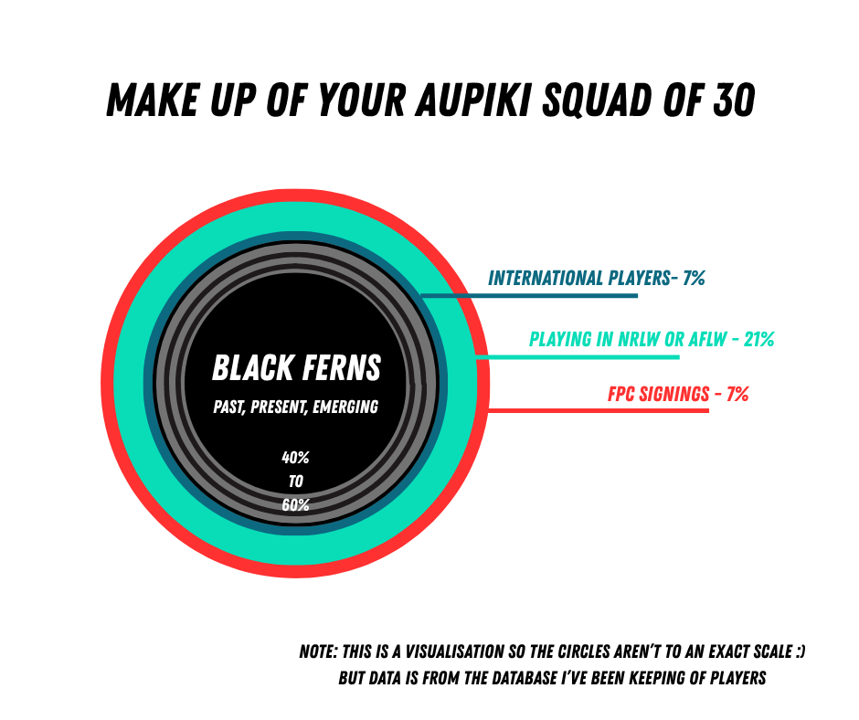 If we think right now on who makes up an Aupiki squad, you start with your Black Ferns - past, present and emerging. This cohort, depending on your franchise, makes up around 40-60% on your squad. Who makes up the remainder? Well, unlike England’s domestic league, it’s not internationals. We have a hard cap of 2 per squad of 30.
